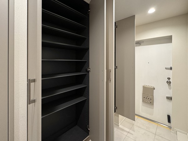 玄関には、トールサイズのシューズボックスが2台並び、圧巻の収納力を発揮します。家族それぞれの靴をしっかり分けて収納できるのはもちろん、季節もののブーツや高さのあるシューズもすっきり収まる頼もしさ。扉を閉めれば表面はすっきりと整い、玄関全体が上品でクリーンな印象にまとまりますよ♥