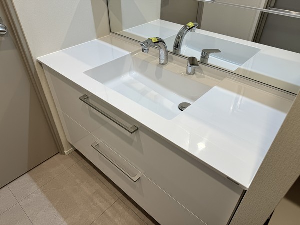 洗面化粧台は、どこか懐かしさを感じさせるレトロな雰囲気。すっきりと収まるコンパクトサイズながら、丸みのあるフォルムや落ち着いた色味が、朝の身支度にほんのり温かみを添えてくれます。洗濯機置き場は洗面化粧台も右側に設けられていました。