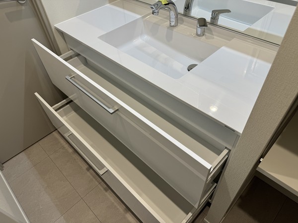 パウダールームは、洗面・収納・バスルームがひとつの動線に心地よく収まった、使い勝手のよいレイアウト✦洗面化粧台のすぐ横にはリネン庫が設けられており、タオルや基礎化粧品、ストック品まで整然と収まります。必要なものがさっと手に届く、このちょうど良さが嬉しいポイント。