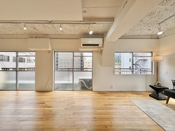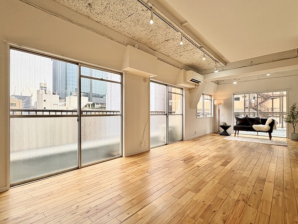 お部屋の広さは18.0帖ほど。南・東・西向きのため陽光が1日中差し込みます。2方面に窓が並び通風も抜群で、明るく快適な居心地。広々とした空間は、リラックスや在宅ワークにも最適です。