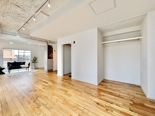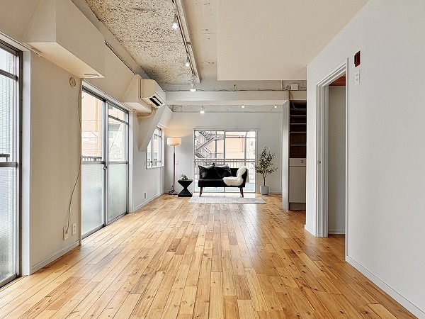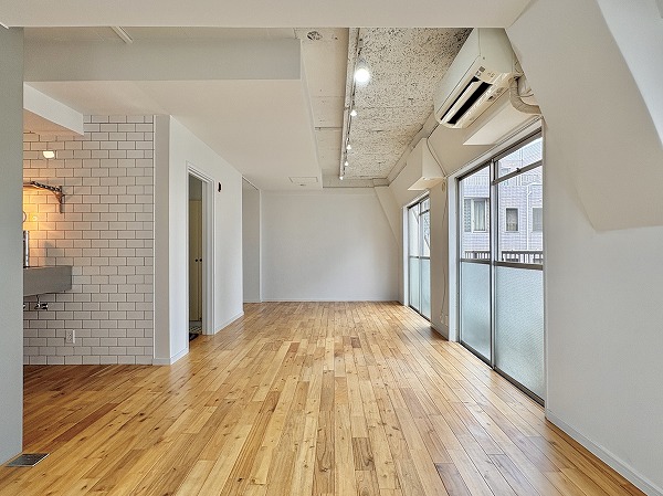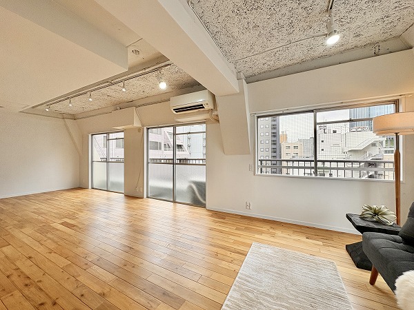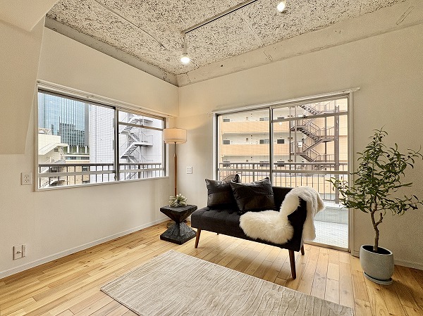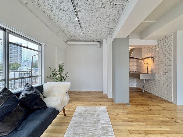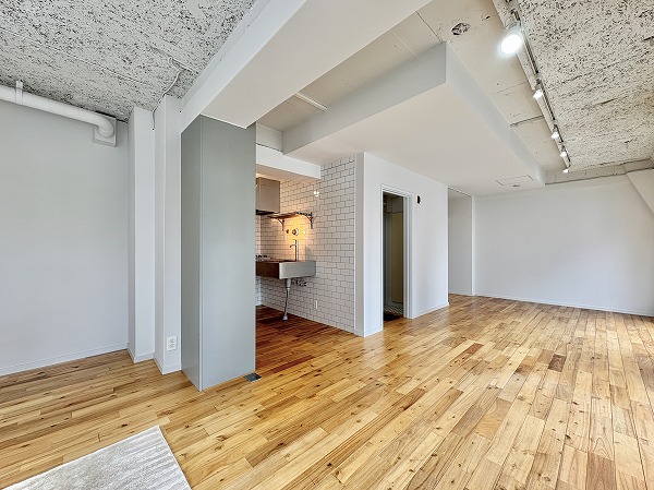 気取らないラフさが魅力の大型ワンルーム。無垢材フローリングと石目調の天井がお洒落な印象を演出しています♡南東・南西角部屋で窓が多く開放的な空間が魅力。また、ルーフバルコニー付きのためたっぷりの光と風が差し込み、明るく開放的な空間が広がります☀現在は約18帖のワンルームですが、売主負担で1LDKに変更することも可能です◎キッチンや洗面など水回りはシンプルでミニマルなデザイン。自炊よりも外食やデリバリー中心のライフスタイル、またはセカンドハウスや事務所としてもぴったり。シャワールームはユニットバスへの変更も相談可能で、ニーズに合わせた使い方ができますよ。ぜひ、気になる方はお気軽にお問い合わせくださいね♪ ライター:hana【25J22】