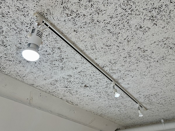 お洒落な塗装仕上げの天井が空間を引き締め、スポットライトは向きを自由に変えられる設計。お部屋全体を優しく照らすことも、特定の場所に光を当てることもでき、照明ひとつで表情が変わる工夫が施されています。