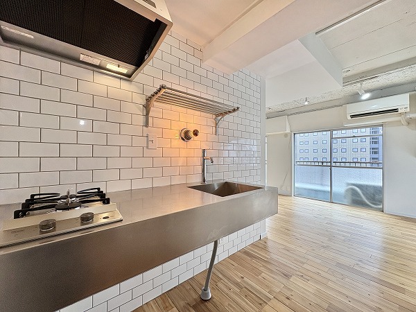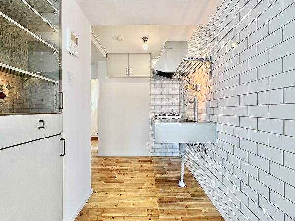 お洒落なホワイトレンガのキッチンスペースは、キッチンでの調理時間が楽しみになりそう♩壁面収納も充実しており、食器やキッチン用品を効率よく整理可能。デザイン性と実用性を兼ね備えた空間です♡