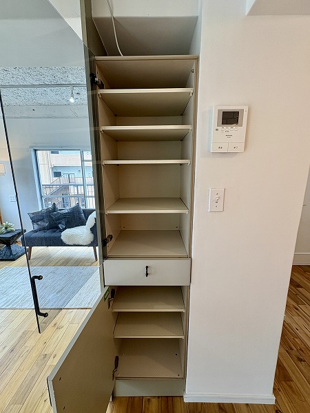 お部屋のオープンクローゼットはハンガーパイプと棚を備え、衣類や小物を整理整頓できます。上部にはカーテンを取り付けられるレール付きで、必要に応じて目隠しも可能◎使いやすさと見た目の両立が叶う収納です。