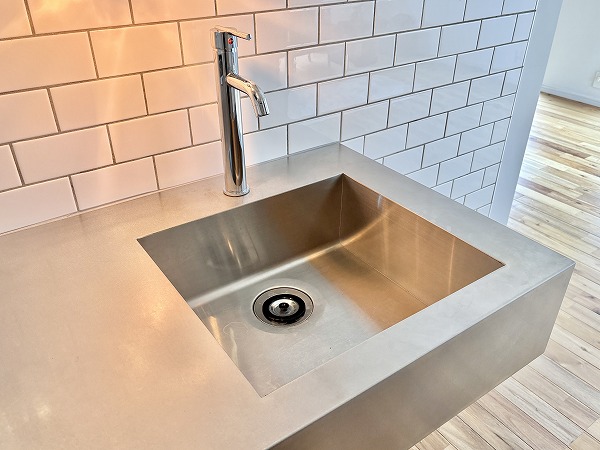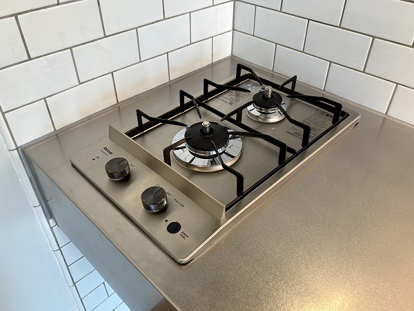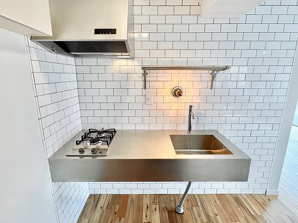 スタイリッシュなキッチンは、足元に空間があるため床掃除もスムーズ。2口コンロを備え、自炊派の方でも快適に料理を楽しめる設計です。コンパクトながら実用性の高い造りで、毎日の料理がより快適になります。