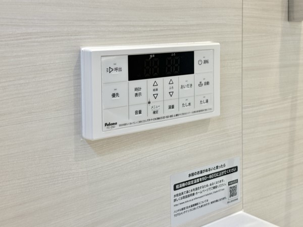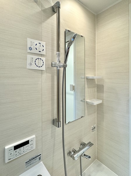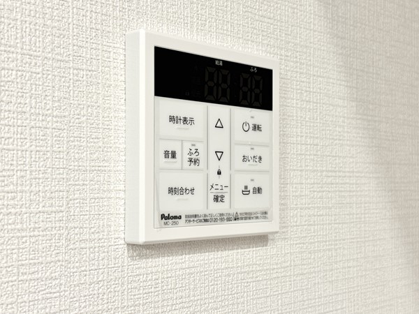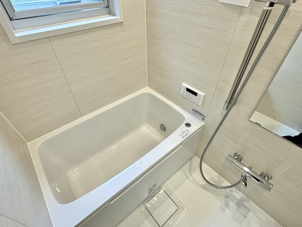 バスルームは飽きの来ないシンプルなデザインです✦出窓からの陽光を感じられるので、朝風呂も快適にできますね。追い焚き機能のおかげで、半身浴も楽しめます♩浴室換気乾燥機を使って、雨の日でも洗濯物ができるので助かりますね。