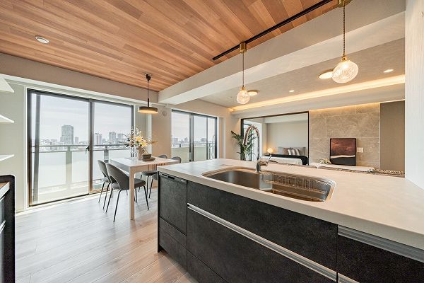 お部屋は2026年3月にリノベーションされたばかりの3LDK。室内に入ると新しく整えられた空間ならではの清潔感が広がり、専有面積は76.02㎡とファミリーにもゆとりのある広さ。ペット飼育も可能なので大切な存在と一緒に暮らせるのも嬉しいポイントです。リビングダイニングキッチンは約18.60帖。南東向きの窓から柔らかな光が入り、日中は照明をつけなくても心地よく過ごせそうな明るさでした。ホワイトをベースに、天井の木目アクセントとフローリングがほどよい温もりをプラス。ナチュラルな雰囲気なので、どんな家具でも合わせやすそう!