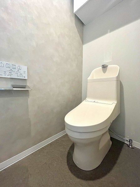 トイレは独立タイプで、プライベート感のある落ち着いた空間。アクセントウォールがさりげないデザインポイントとなり、シンプルながらもお洒落な雰囲気に仕上がっています。収納には吊戸棚を活用してくださいね。