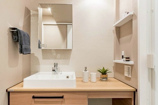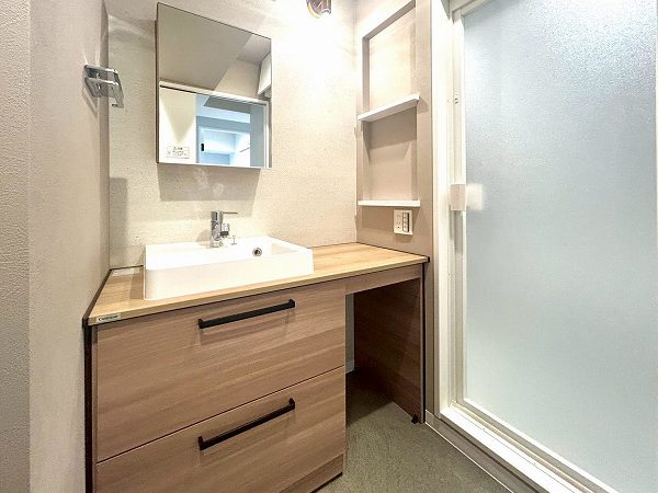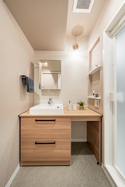 木目デザインが印象的な、可愛らしい雰囲気のパウダールーム。広々としたカウンターが設けられており、メイク道具やスキンケア用品を並べながら快適に身支度ができます。横の収納棚にはよく使うアイテムを並べておきましょう♪