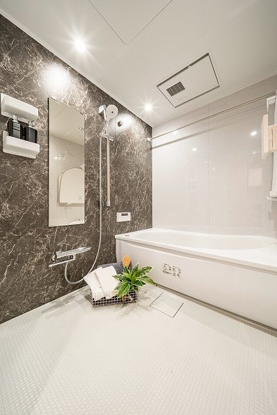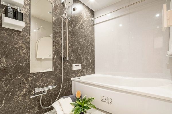 モノトーンパネルをアクセントに取り入れた、シックで落ち着いた雰囲気のバスルーム。1418サイズのゆとりある設計により、浴槽では足を伸ばしてゆったりとくつろぐことができ、毎日のバスタイムが癒しの時間になりそうです。追い焚き機能も備わっているため、ご家族の入浴時間が異なってもいつでも快適な温度で入浴可能♡