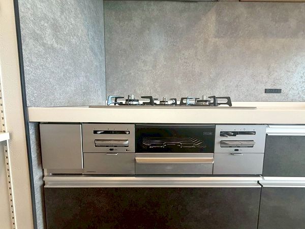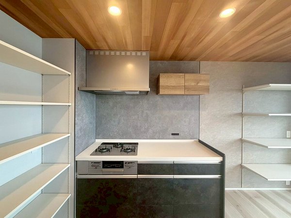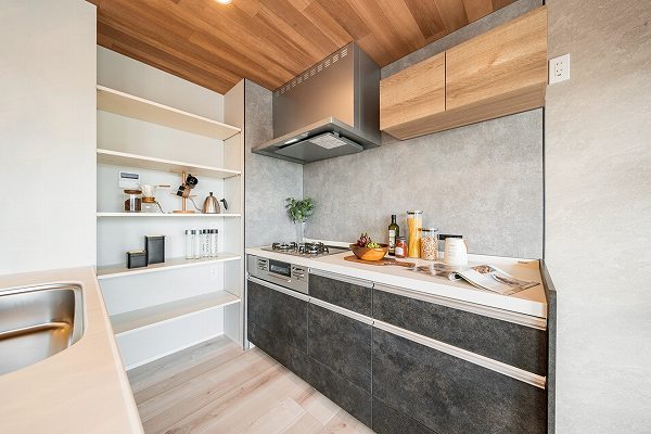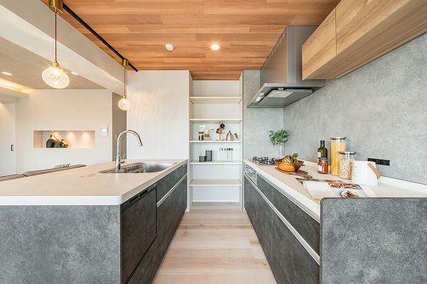 スタイリッシュなモノトーンカラーが印象的なⅡ型キッチン。広々としたワークスペースが確保されており、複数人での調理もスムーズに行えます。収納スペースも豊富に設けられているため、キッチンまわりをすっきりと美しく保てるのも嬉しいポイント◎