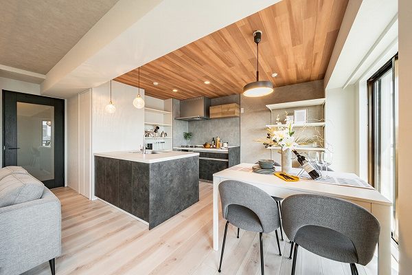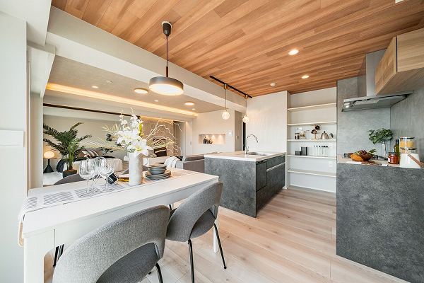リビングダイニングキッチンは約18.60帖のゆとりある広さ。南東向きの窓からは陽光がたっぷりと差し込み、家族が自然と集まるポカポカ空間です♥ホワイト基調の空間に天井の木目アクセントと木目フローリングが調和し、ナチュラルな内装に仕上がっていますよ。