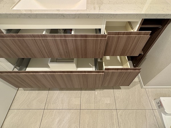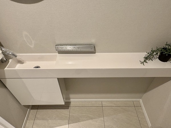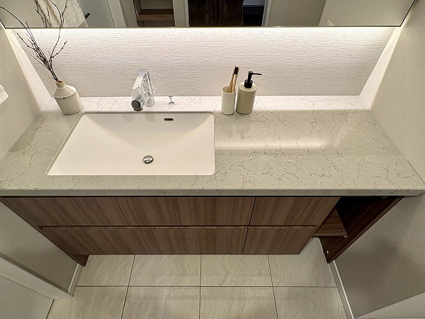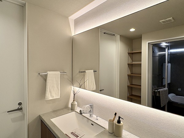 優しい色味のこちらの化粧洗面台は広々として使い勝手が非常に良さそうでした◎照明は明るく、スタイリングやメイクアップの際に最適。洗面台はボウルとカウンターがそれぞれ広く、忙しい朝でもスマートに身支度していただけます✧