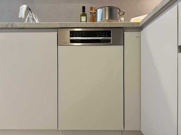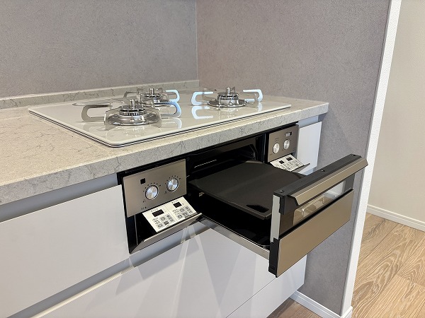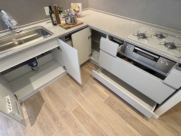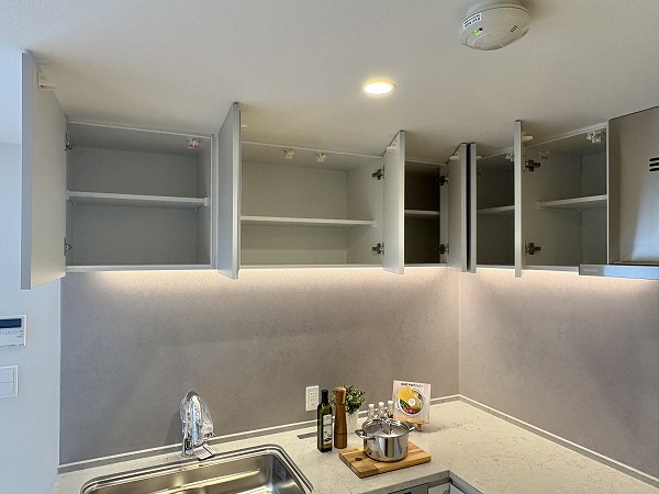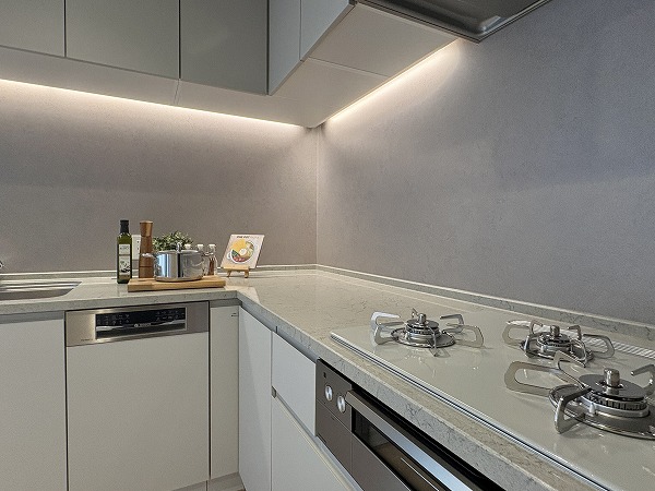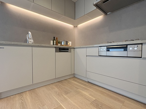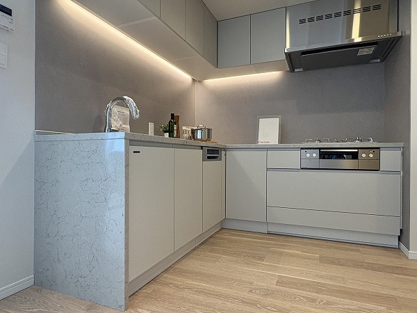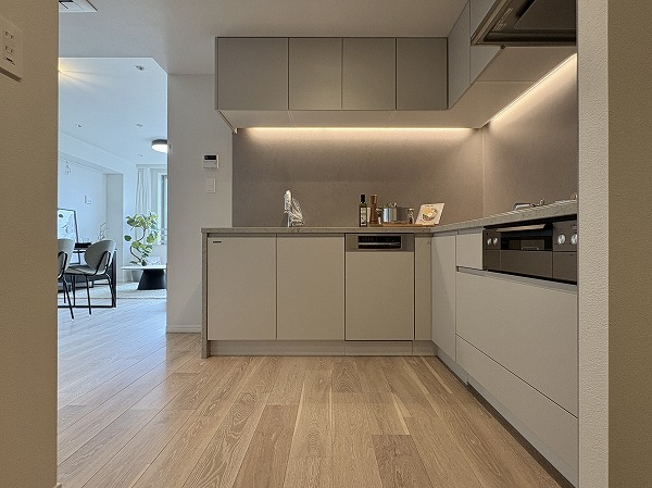 スタイリッシュなL字型のキッチン。間接照明によって照らされた調理スペースは、オシャレなレストランの厨房のようです。キッチンからはリビングダイニングが見渡せるので、家族の団らんに参加することもできますよ♩