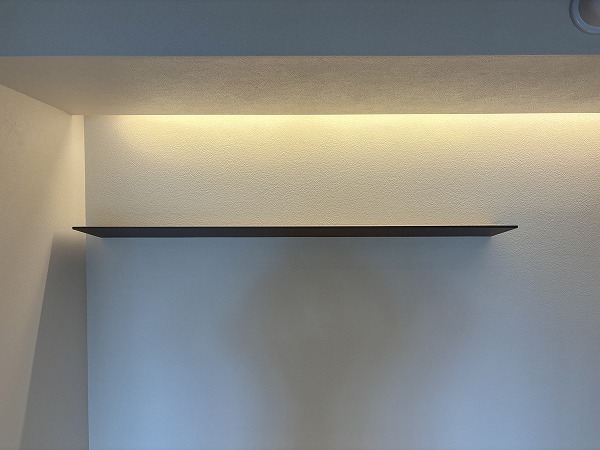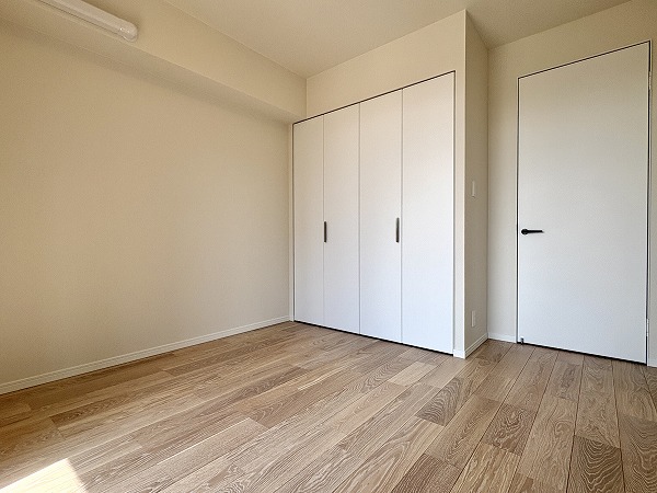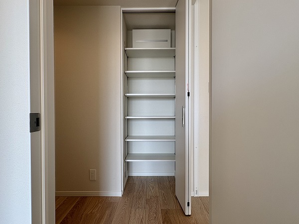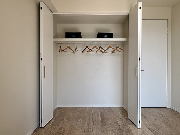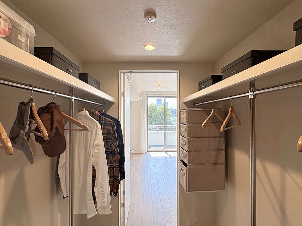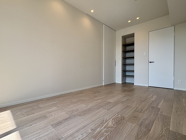 最奥部には約8.4帖の寝室がありました。こちらのお部屋は収納が豊富で、ウォークインクローゼットに加えてオープンラックまで。オープンラックには本や小物などをディスプレイし、衣類やアウトドア用品などのかさ張るアイテムはウォークインに詰め込みましょう◎