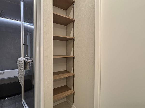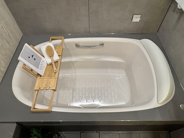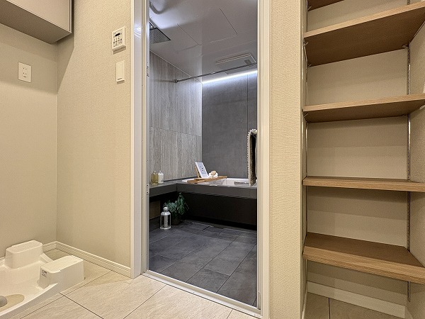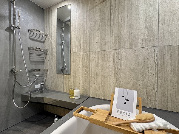 バスルームはホテルライクな大人空間になっておりました。グレーを基調とした色味は目に優しく、ご入浴の際には日々の疲れを癒してくれることでしょう。汚れが目立ちずらく、お掃除が簡単であるというメリットもありますよ♪