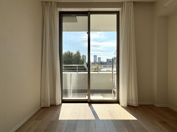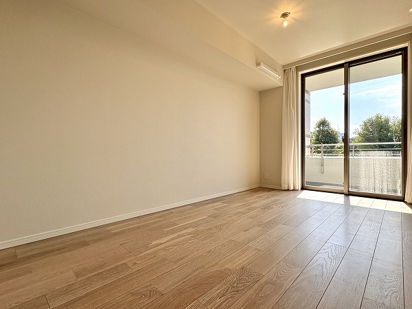 約8.4帖の洋室の窓はバルコニーに直結!バルコニーもメインルームの窓と同様に南向きのポカポカ空間☀洗濯物はみるみる乾くことでしょう。暖かい季節にはバルコニーでのんびり過ごすのも素敵です。