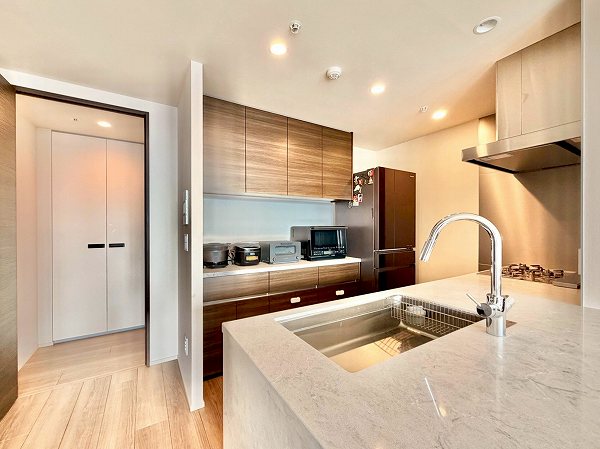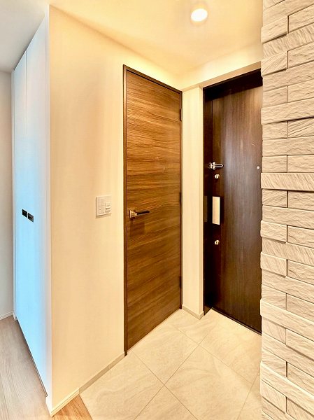 ご紹介したのは39階部分、2023年2月築のワンオーナー住戸。玄関に足を踏み入れると、エコカラットの質感がやわらかく迎えてくれました。シューズインクローゼットやトランクルームなど、収納が自然に生活を支えてくれる点も好印象です。水まわりはパウダールームに機能を集約し、トイレは独立。動線に無理がなく暮らしの流れがきれいに整えられています。