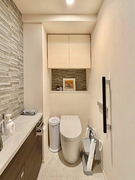トイレはパウダールームと切り離された独立空間。生活動線に配慮された、使い勝手の良さが光ります。タイルのアクセントがさりげなく個性を添え、無機質になりがちな空間に表情をプラス。手洗いカウンター付きで見た目と実用性を両立しています❀