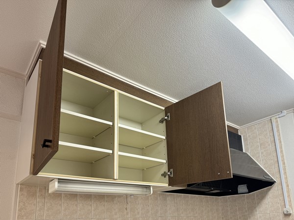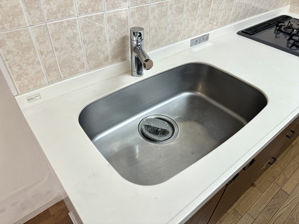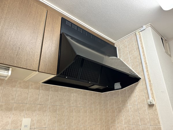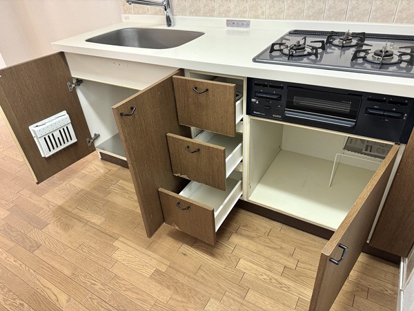 壁付タイプのシステムキッチンは、まさに”シンプルイズベスト”なデザイン。水栓やレンジフードも交換されました。収納部分も充実しているので、かさばりやすい食器類や調理器具もスッキリ整理可能。