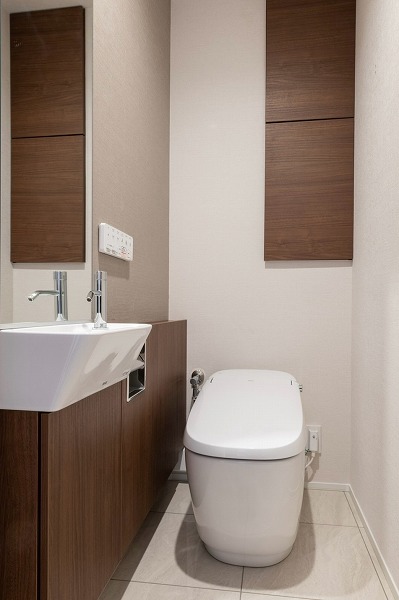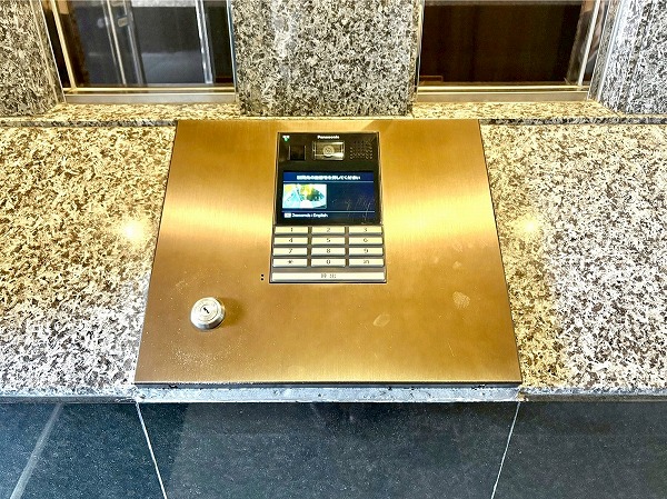 エントランスはストーン調のタイルを採用したラグジュアリーな空間でした。オートロックと全体が映る位置に防犯カメラが設置されているので防犯対策が万全◎