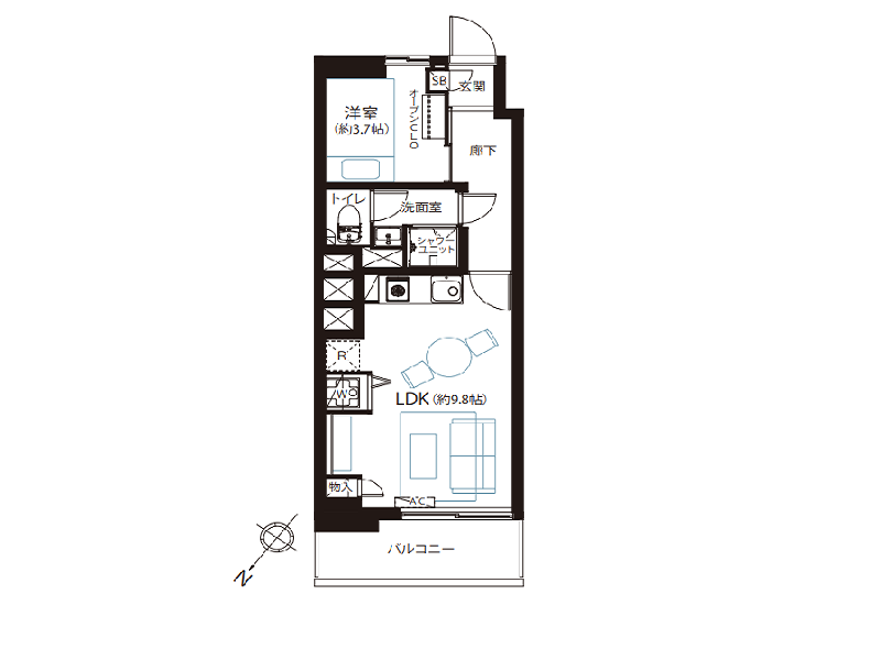メインルームは約9.8帖。北西向きの優しい陽光が入る爽やかな空間です。こちらの一室は厳選家具付きなので、忙しい方やインテリアに自信がない方も安心◎入居直後から洗練された暮らしをスタートできますよ。