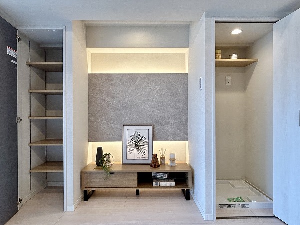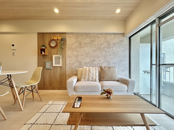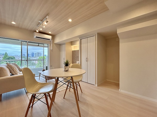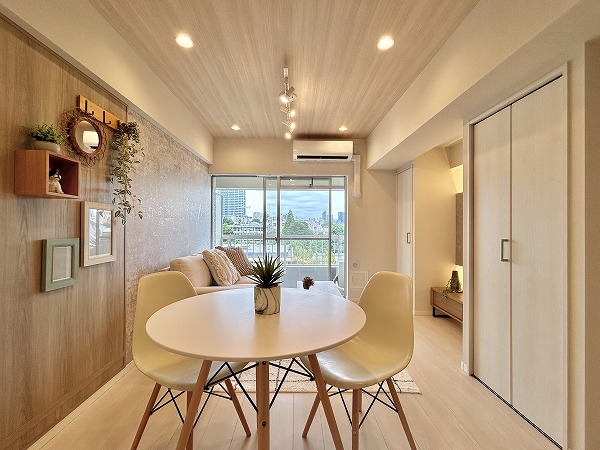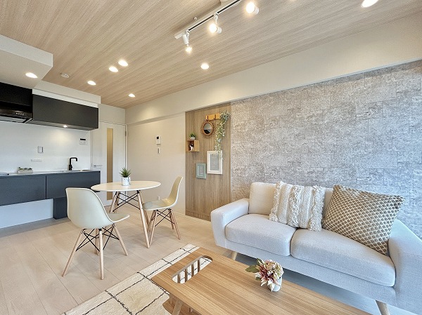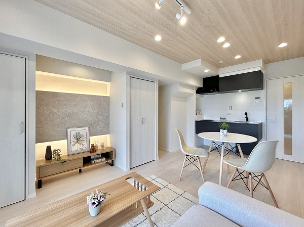 リノベーションが施された、インテリアのセンスを引き立てる専有面積31.81㎡・1LDKのお部屋。ベージュの木目天井や間接照明のアクセントウォールなど、細部にまでこだわったデザインが魅力です♪