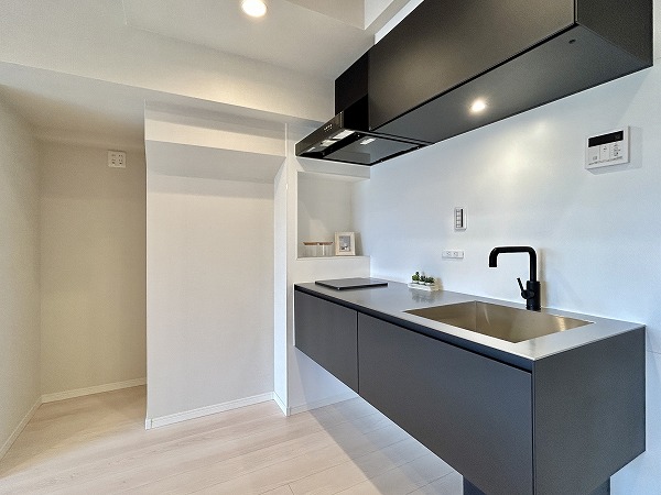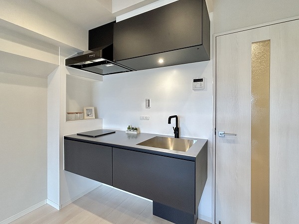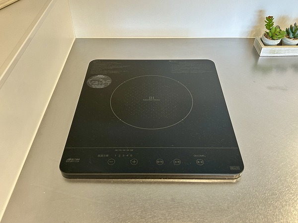 コンパクトなIHコンロ付きキッチンは、外食中心の方や軽い自炊に便利◎サッと拭くだけで手入れができ、毎日の生活に無理なくフィットする設計です。