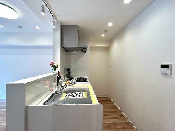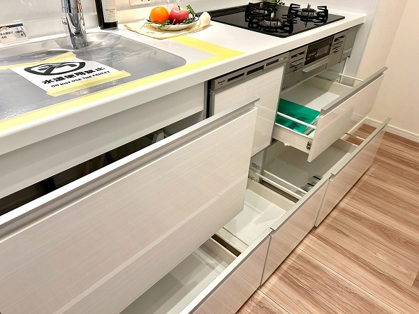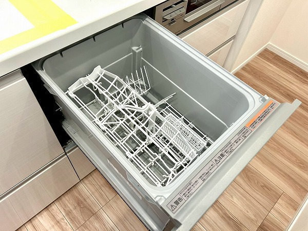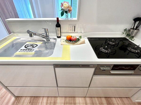 キッチンは対面式のため、家族や友人とコミュニケーションを取りながら料理を楽しめます。グリル付きの3口コンロに加え、食洗機も備わっており、日々の家事を快適にサポートしてくれますよ。