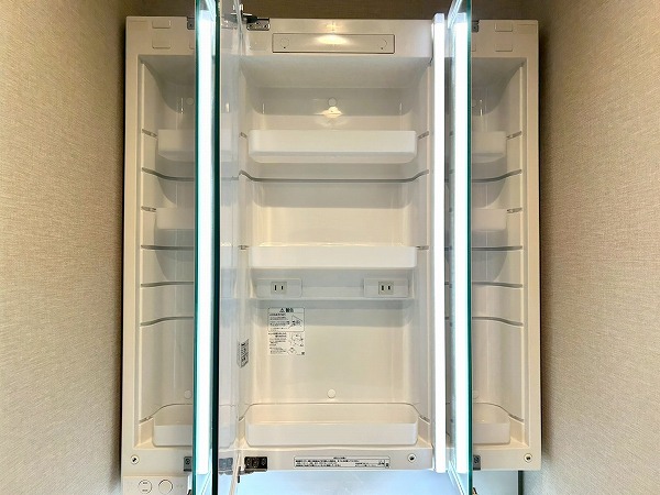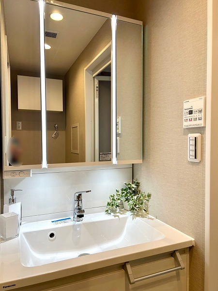 洗濯機置き場、洗面化粧台、バスルームがまとまったパウダールームは、家事や身支度がしやすいスムーズな生活動線を実現。3面鏡付きの洗面化粧台は身支度がしやすく、鏡裏収納など収納力にも優れています。