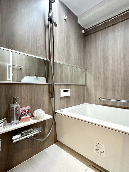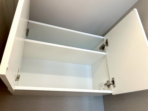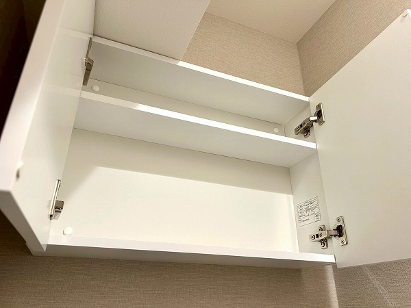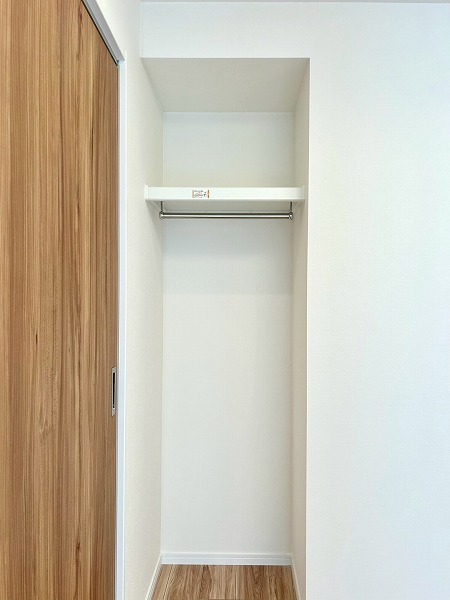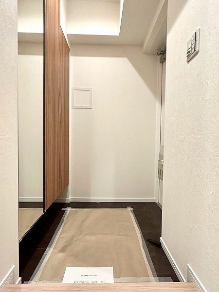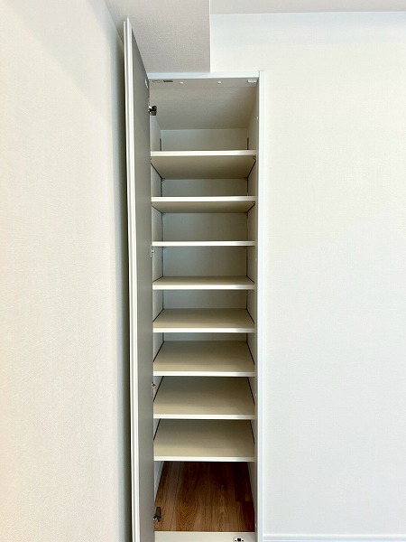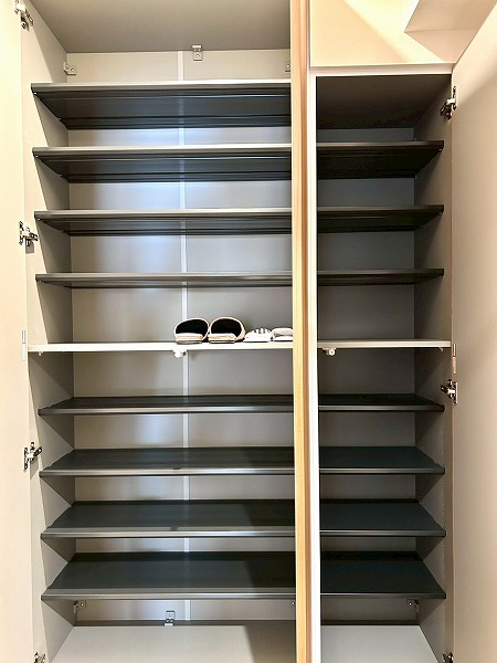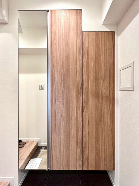 玄関には大容量のシューズボックスが設置されており、靴をすっきり収納できるため、常に整った印象を保てます。扉には姿見が備わっており、外出前の身支度チェックも快適に行えます。