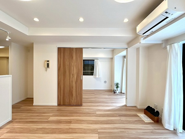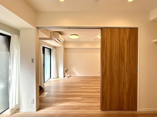 メインとなるLDKはゆとりのある広さがあり、主要な家具を置いてもスペースに余裕がありそう。隣接する洋室はスライドドア仕様のため、開けることで開放感が生まれ、より広々と使うことができます。各洋室にはウォークインクローゼットなどの収納も備わっており、収納力もしっかり確保されています。