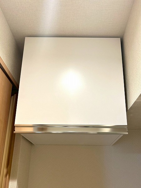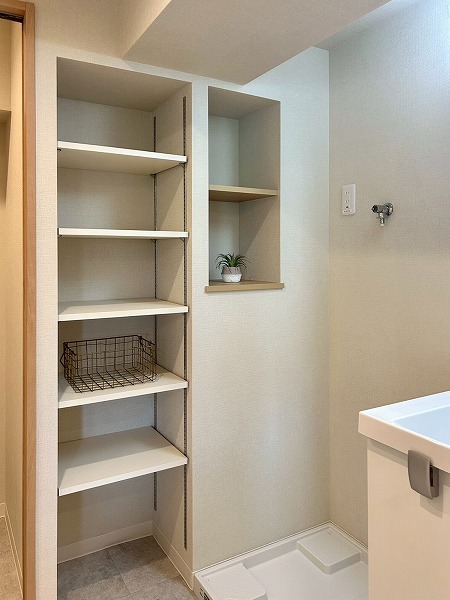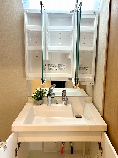 サニタリールームは洗面台・洗濯機置き場・バスルームを集約した効率的な設計。オープン収納付きで日用品の管理が簡単で、忙しい朝の家事もスムーズに。洗面化粧台は3面鏡仕様で、身支度や小物整理もしやすく便利です。