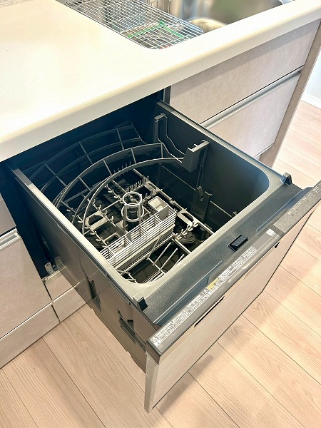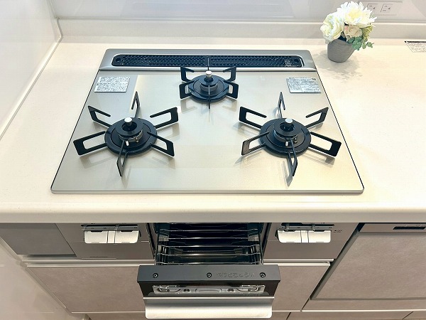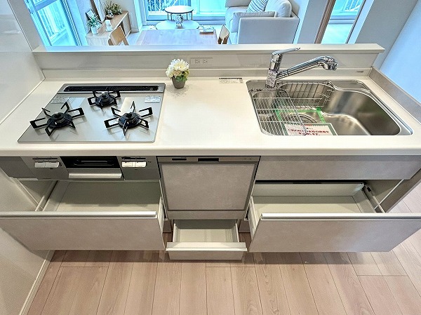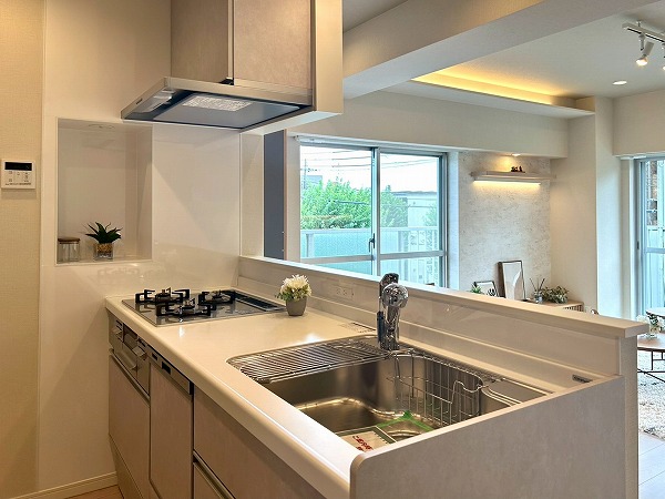 対面式のキッチンは、料理をしながら家族や友人との会話も楽しめる設計。正面に大きな窓があり、明るく風通しの良い環境で気分よく調理ができます。3口コンロ、食洗機完備で後片付けもラクラク♪毎日の家事が快適にこなせる作業動線も魅力です。
