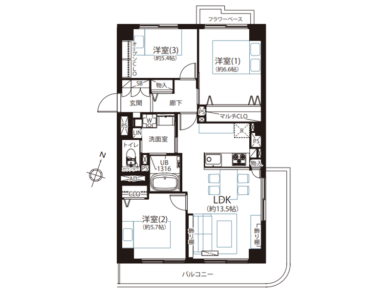 こちらのお部屋は専有面積67.85㎡の3LDK。ファミリー層やカップルにおすすめの広さです。家具付きで、引越し直後からお洒落な空間を演出可能◎落ち着いた色調のフローリングとクロスが、長く暮らしても飽きの来ない居心地の良い住まいを提供してくれます。
