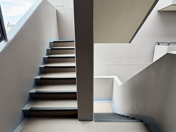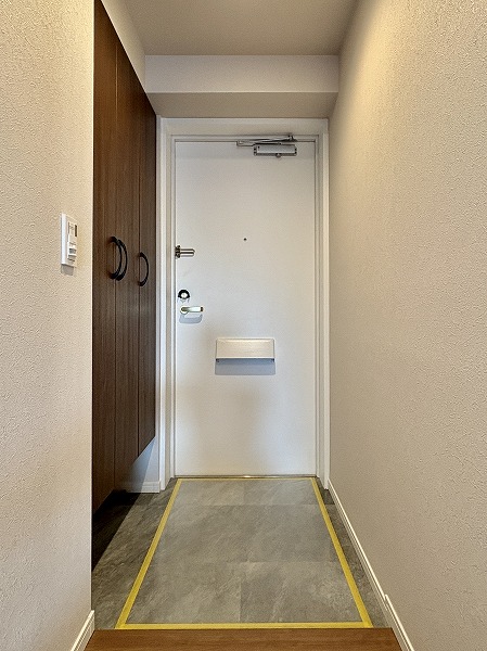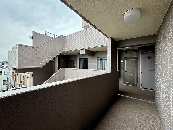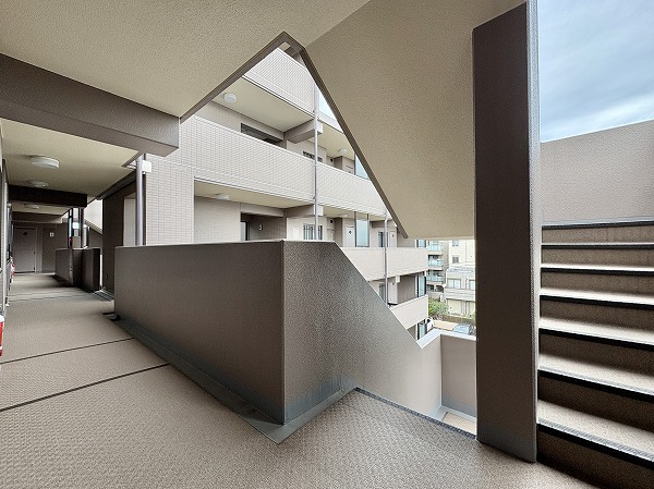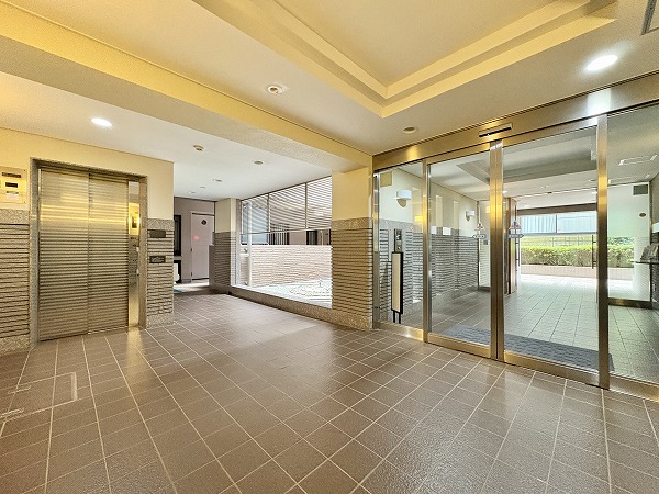タイルが美しく敷き詰められたアプローチを進むと、緑に包まれた静かなエントランスが姿を見せます。奥まった位置に入口が設けられているため、プライバシー性が高く安心。整えられた植栽が上品な雰囲気を演出しています。