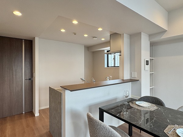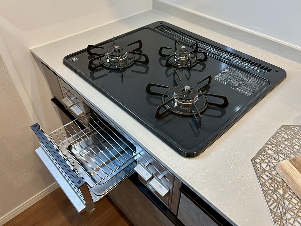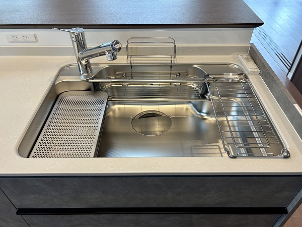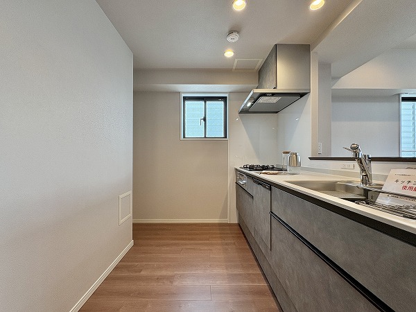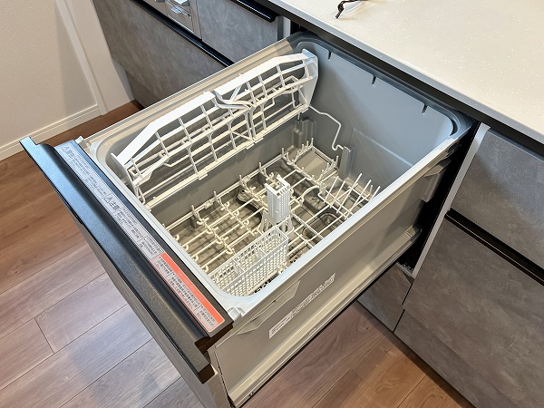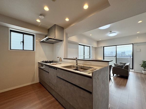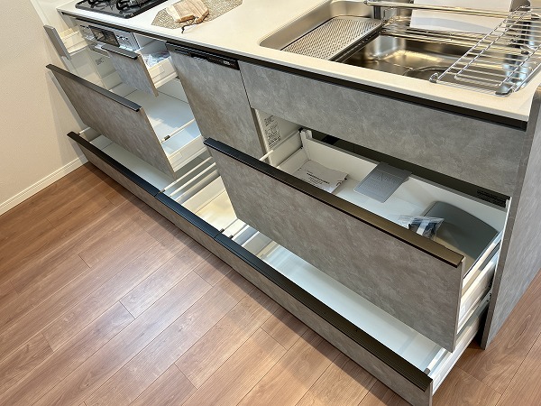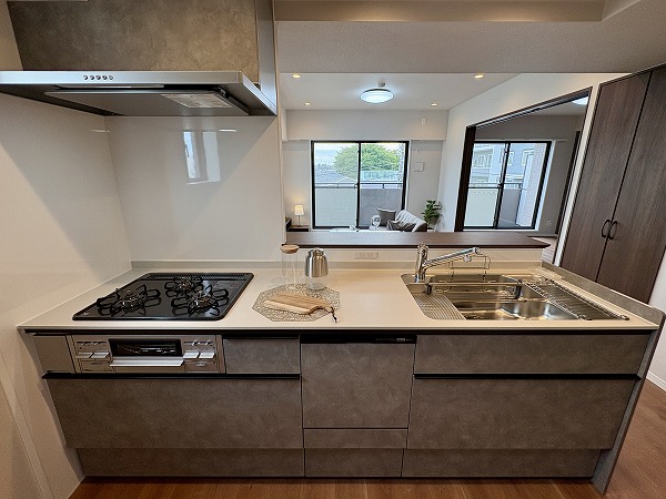 上品なグレートーンでまとめられたシステムキッチンは、リビングを一望できる対面式。ワイドな設計で複数人の同時作業もスムーズに行えます。食洗機付きで家事の時短にも◎ 広めのワークトップが料理時間を快適にしてくれます。