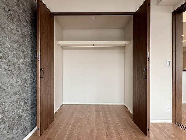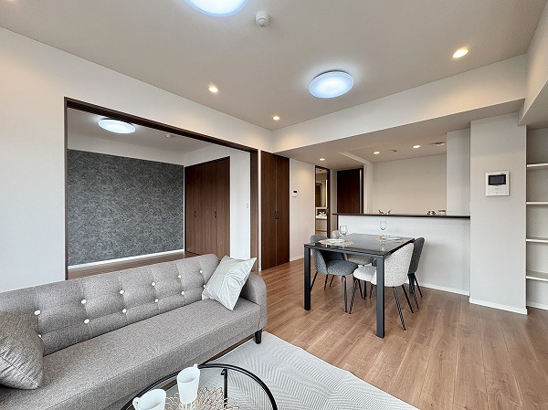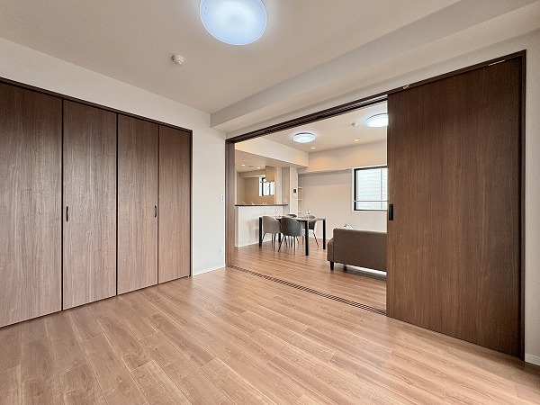 リビングに隣接する約6.0帖の洋室は、大きなスライドドアで仕切りが可能。ドアを閉めれば独立した個室に、開ければ一体感のある広々とした空間に早変わり。ゲストルームやお子さまのプレイルームとしても使いやすい間取りです。
