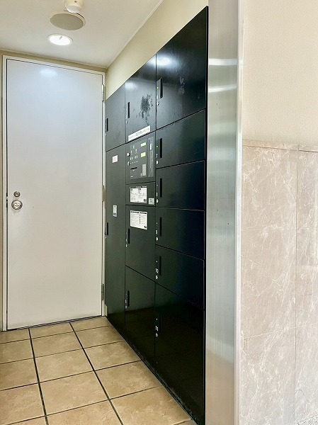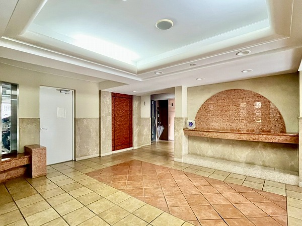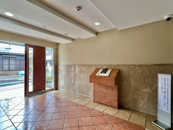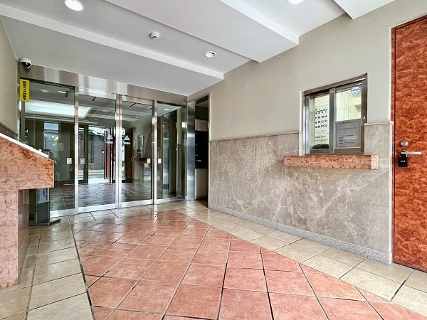 縦に伸びる複数の窓が外の光を取り入れ、明るく開放的なエントランス。セキュリティ面では管理人室・オートロック・防犯カメラを備え、宅配ボックスも設けられた充実の共用部です。