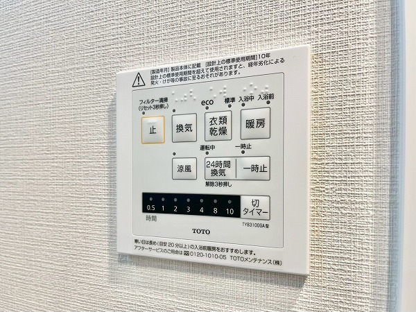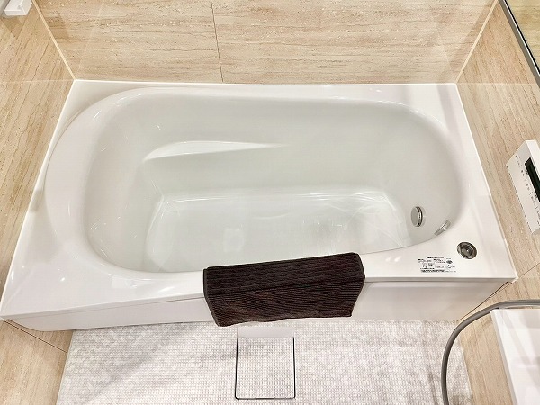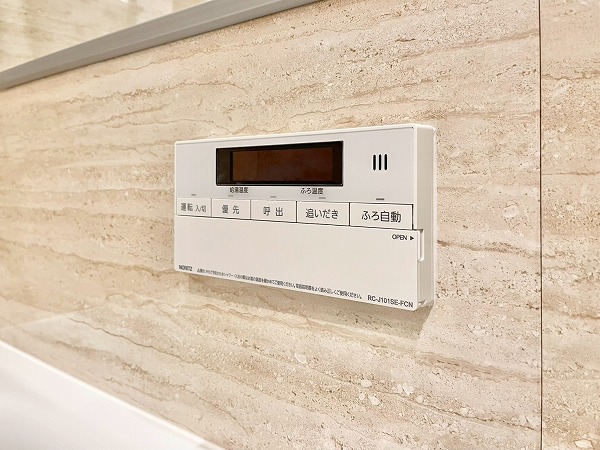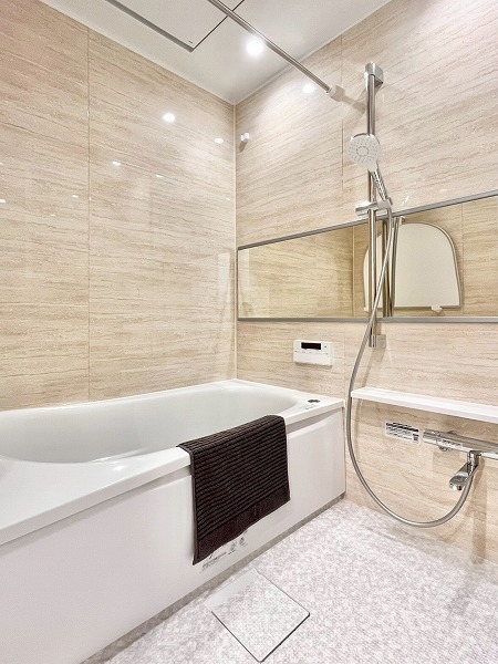 艶のあるパネルがホテルのような高級感と落ち着きを醸し出すバスルーム。バスタブには追い焚き機能を備え、個人の好きなタイミングで、いつでも温かい湯船を楽しむことができます。洗濯を終えたら浴室乾燥機能を使ってすぐに乾かすことができ、生活動線に無駄がありません。