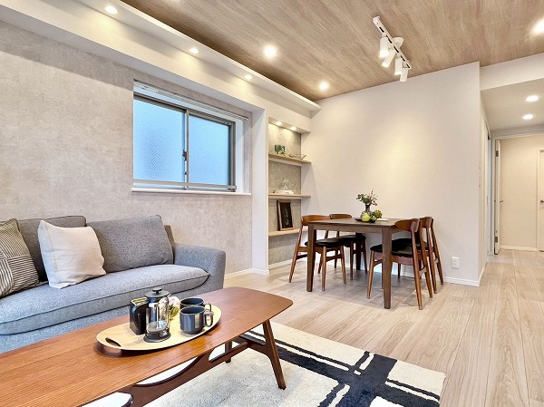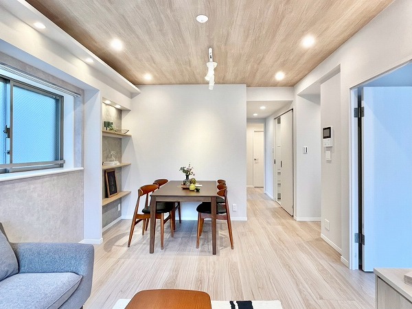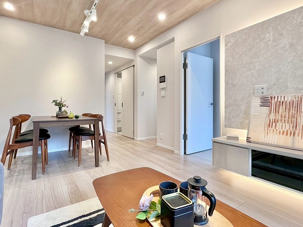 キッチン・ダイニングとリラックススペースが緩やかにゾーニングされながらも、空間全体に一体感のある設計。ダイニングからテレビを楽しみつつ、ソファからはキッチンの気配も感じられ、家族の会話が自然と生まれる距離感です。隣接する洋室も一体的に使うことで、より広がりのある空間として活用できます。
