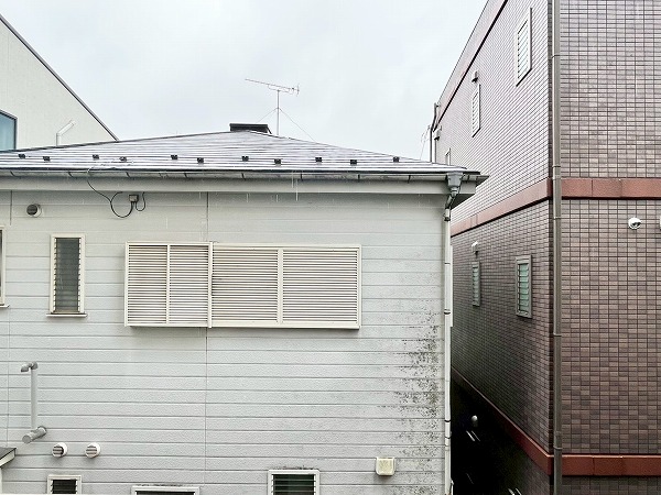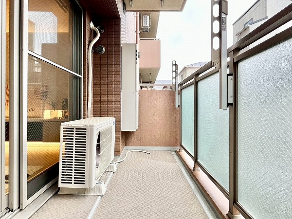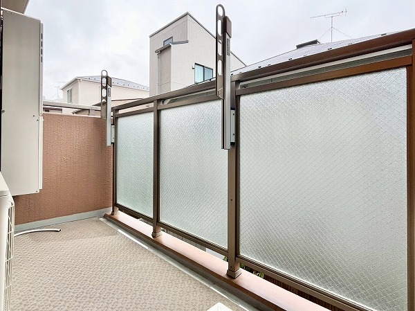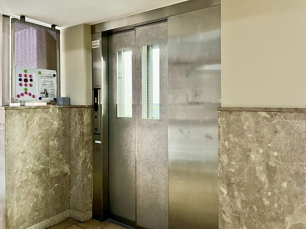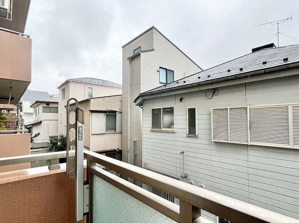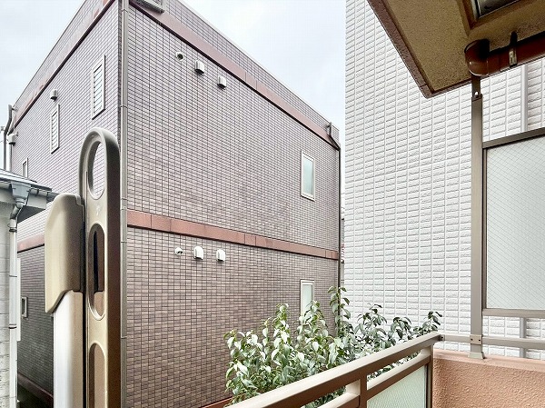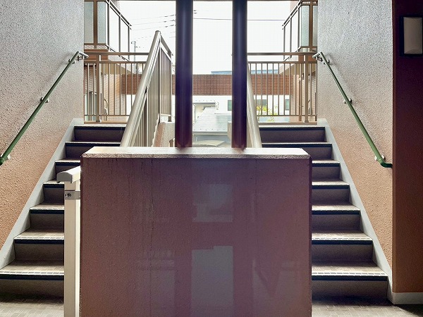 外廊下タイプですが、エレベーター・住戸扉の周りは屋根や壁に囲まれており、雨や風の影響を受けにくくなっていました。外階段付近には風の流れがあり、空気がこもりにくく爽やかな雰囲気が感じられます。