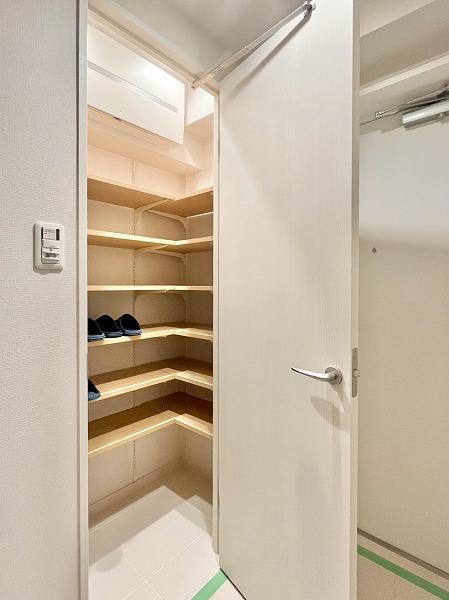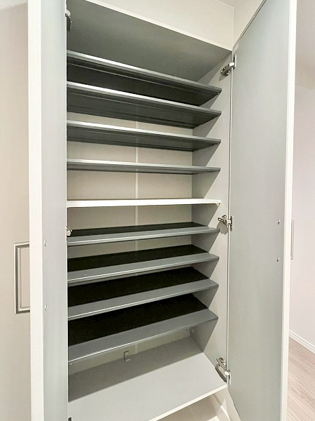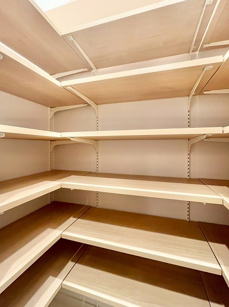 玄関にはシューズボックスに加え、シューズインクローゼットを備えた収納力の高い設計。三面にわたってシェルフが設けられており、日常使いのシューズはもちろん、季節物やアウトドア用品までまとめて収納でき、使い勝手の良さを感じますね。狭さを感じがちな玄関まわりをすっきりと保ちやすく、スペースを有効活用できます◎
