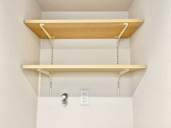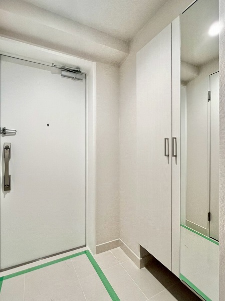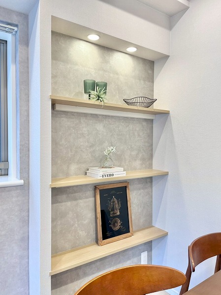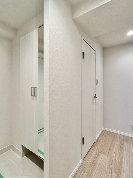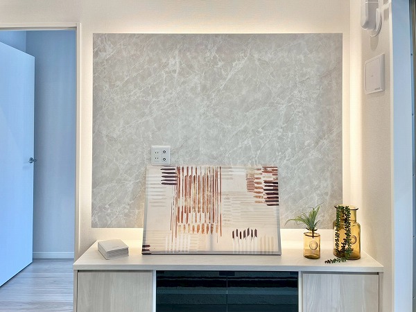 ホワイトを基調とした廊下の突き当たりにはお花や小物を飾れるカウンターを設置。カウンターを境にドアで仕切られる造りとなっており、玄関まわりと生活空間が自然に分けられている点も魅力です。来客時や宅配対応の際にも視線が直接室内に入りにくく、プライバシーに配慮された設計がありがたいですね。