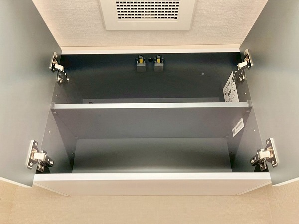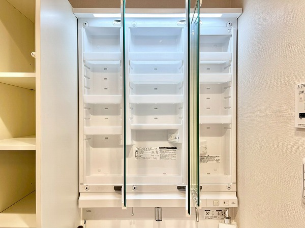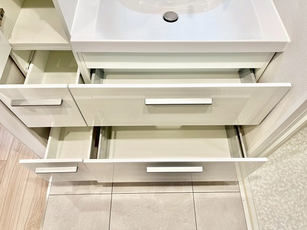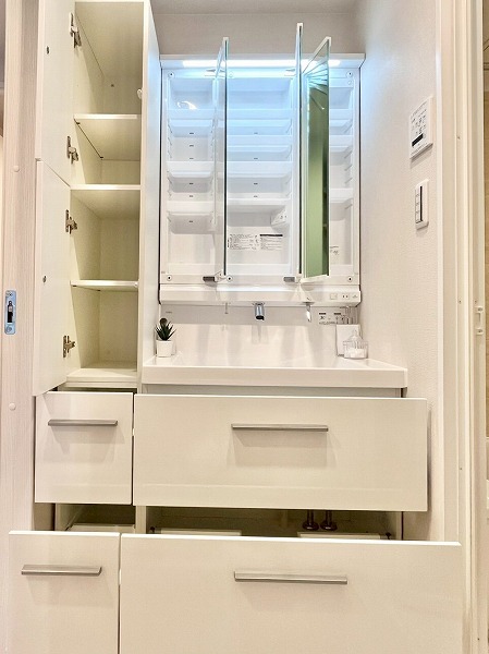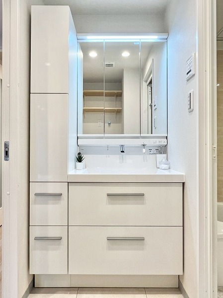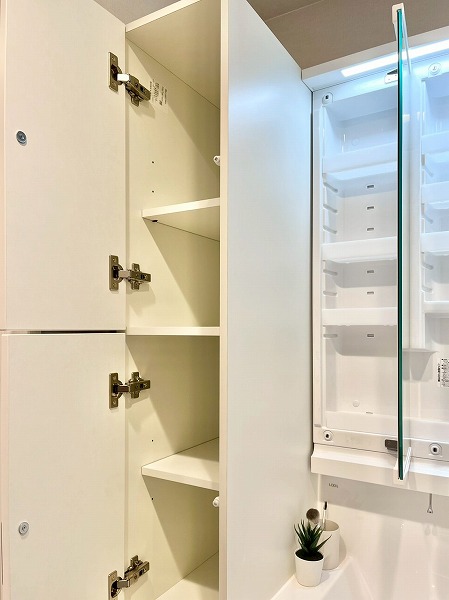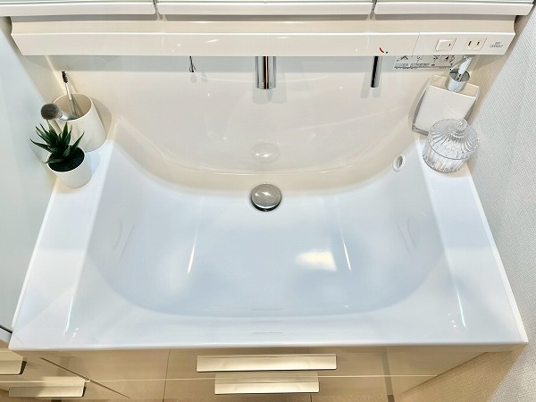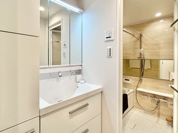 広さのある洗面ボウルを備えた洗面化粧台は、洗顔の際に特に使い勝手を感じられそうですね。扉付きの一体型キャビネットはリネン類も清潔に収納でき、身支度の前後に取りやすく便利。スキンケアアイテムやお掃除用品は鏡裏や下部に分けて収納できるため、バスまわりや洗面まわりをすっきりと保てるのも魅力です。