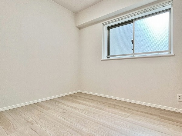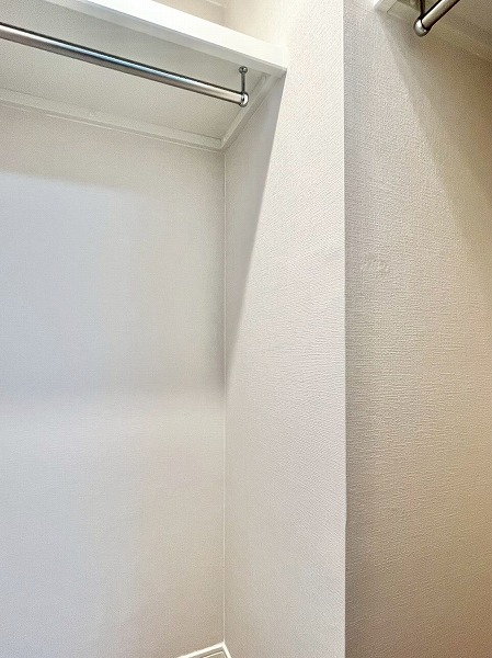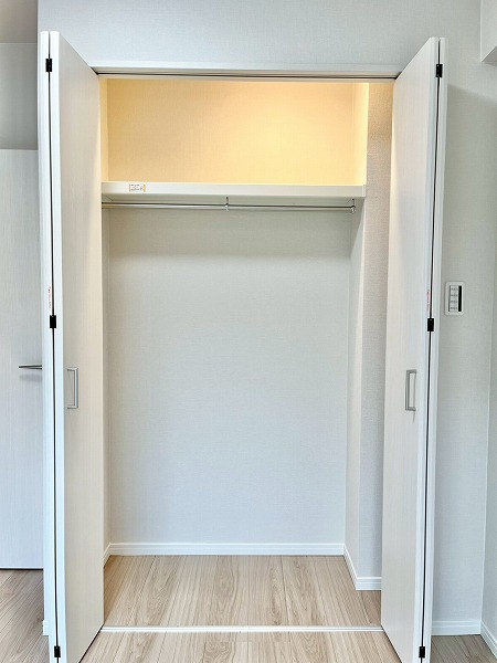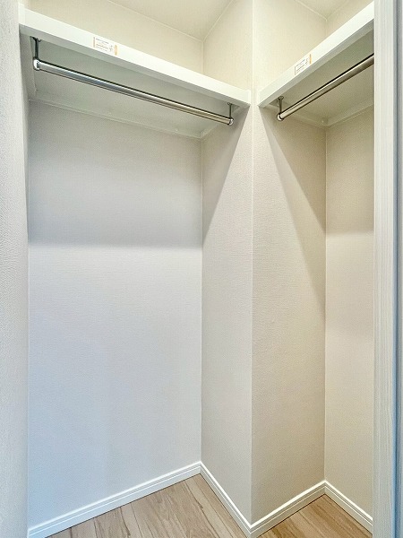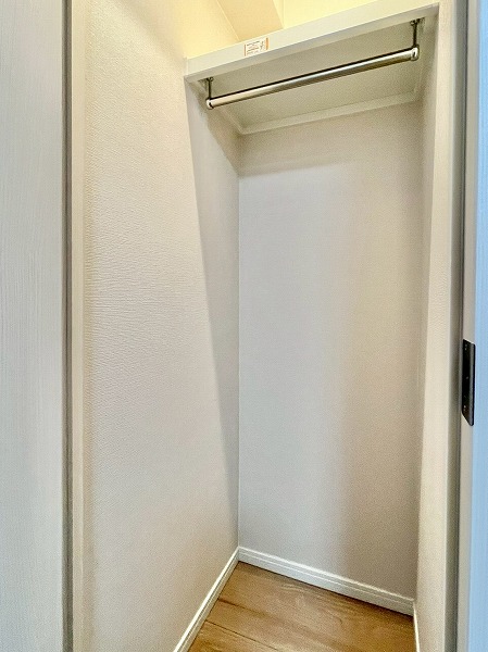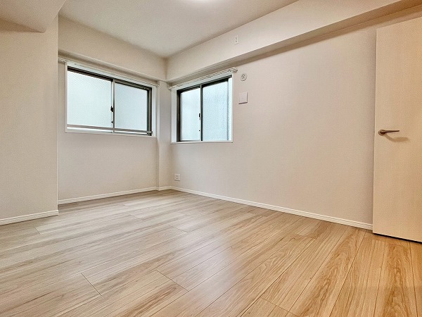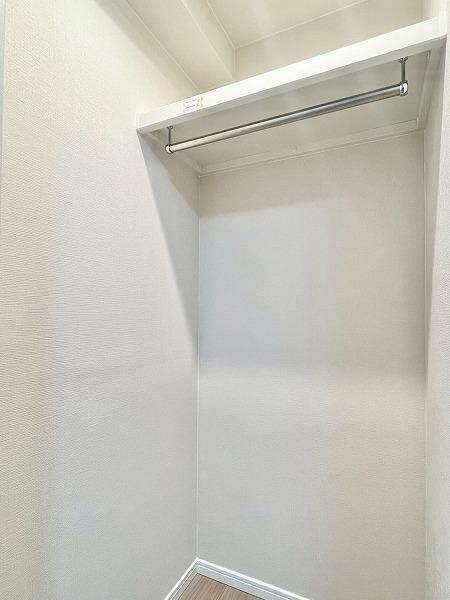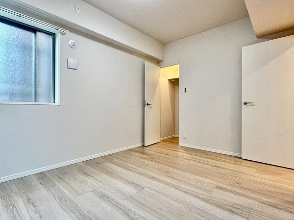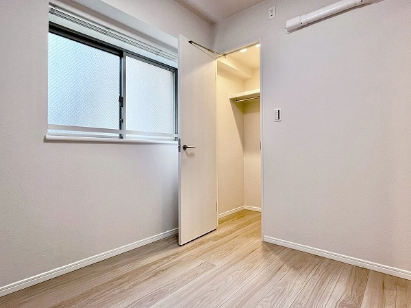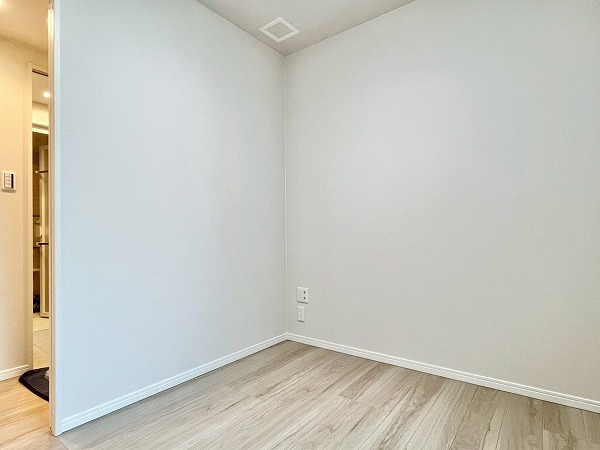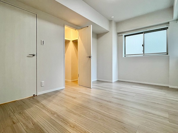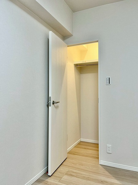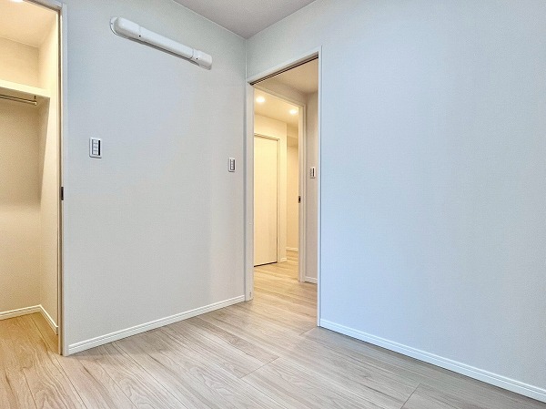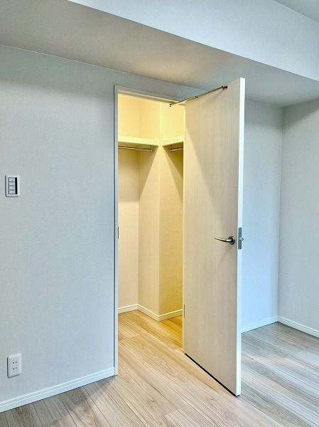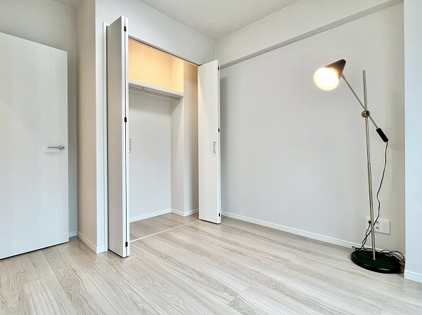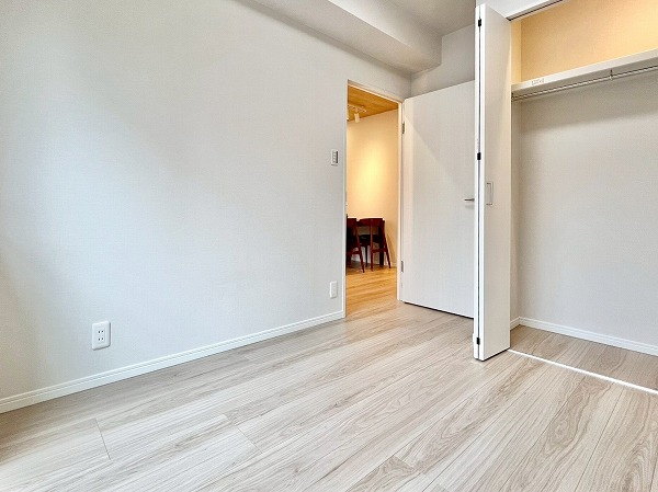 一番広い洋室はメインルームから離れ、落ち着いた空間です。およそ6.3帖の広さが確保されているので、寝室にもぴったり。大きめのベッドの他に趣味の物やクッションなど置いて自分らしい空間を作れる余白が残されていました。室内にはなんと2つのクローゼットを備え、充実した収納スぺースも魅力です。