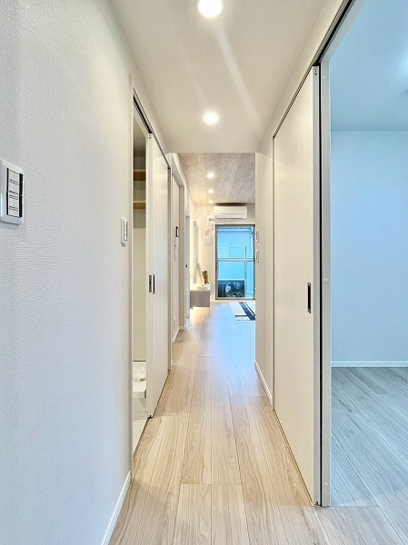 今回ご紹介したのは、2階に位置する家族で暮らせる3LDK。メインルーム内からはキッチン・パウダールーム・2つの洋室にアクセスできる仕様で、扉を隔てて廊下が続きます。外と中がはっきりと分けられているのに加えて角部屋ということもあり、日々の暮らしにプライバシー性や安心を感じられる住宅設計になっていました。