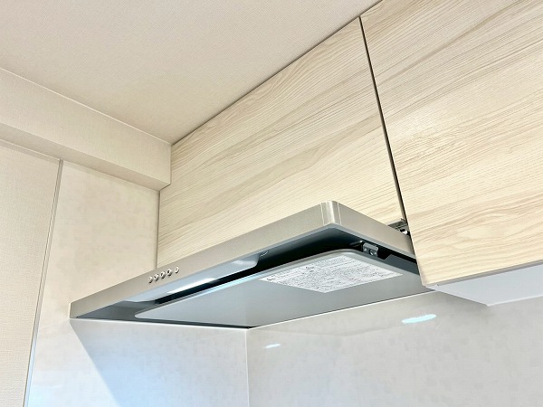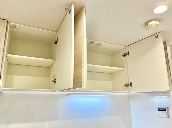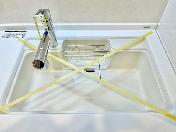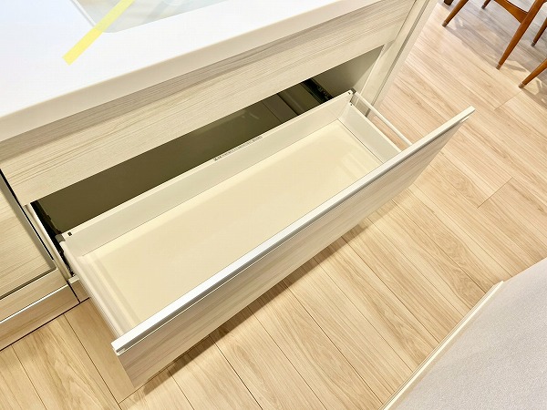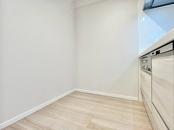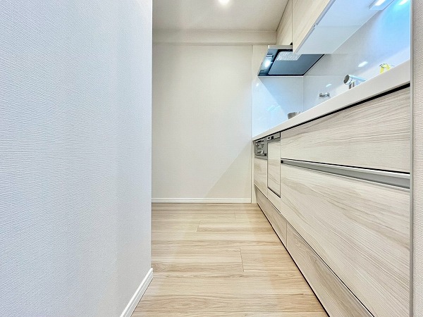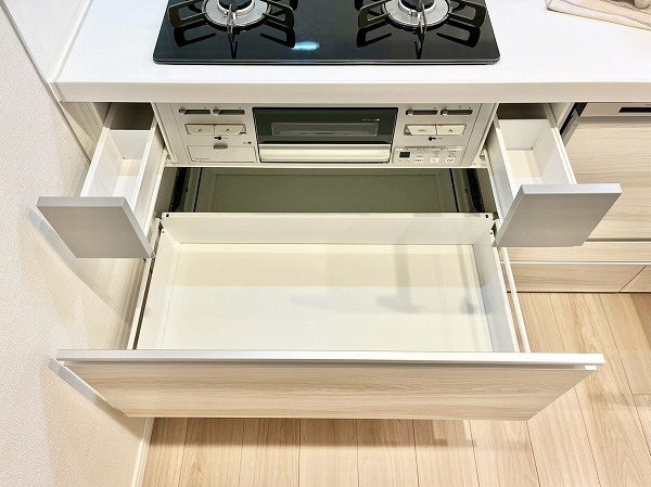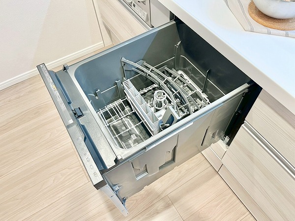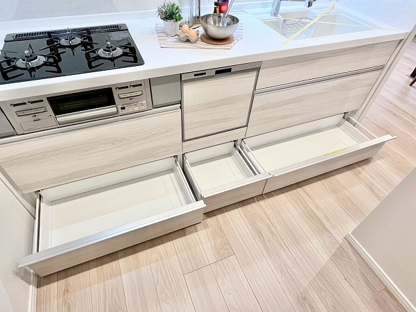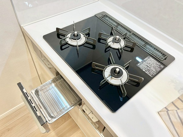 システムキッチンには3口コンロと広々としたシンクを備え、快適にお料理を楽しめる環境が整っています。リビングからキッチンが見えにくいため、来客が多い方でも気兼ねなく過ごせそうです。シンク下には食洗機を備えており、家事の時間を趣味やリラックスの時間にあてられます◎