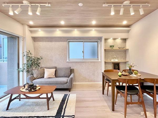 2階に位置する南西向きの角部屋。陽当たりを重視する方におすすめのお部屋です。床暖房を備えた足元の快適さに加え、ダウンライトや間接照明がやわらかな光を広げ、空間に温もりをプラスします。木目の質感も相まって、季節を問わず心地よく過ごせる住まいに仕上がっています。