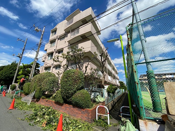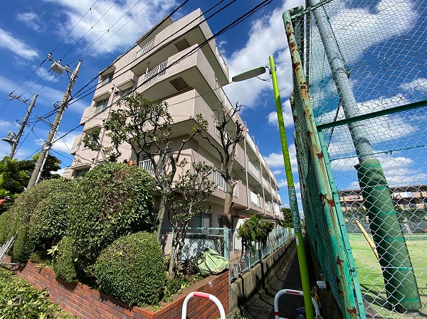尾山台駅から徒歩19分、青々と緑が茂るこちらのマンションが今回ご紹介する『ハイネス尾山台』です。築年数は経っていますが、何度か改修工事等が行われているので快適にお過ごしいただけますよ。